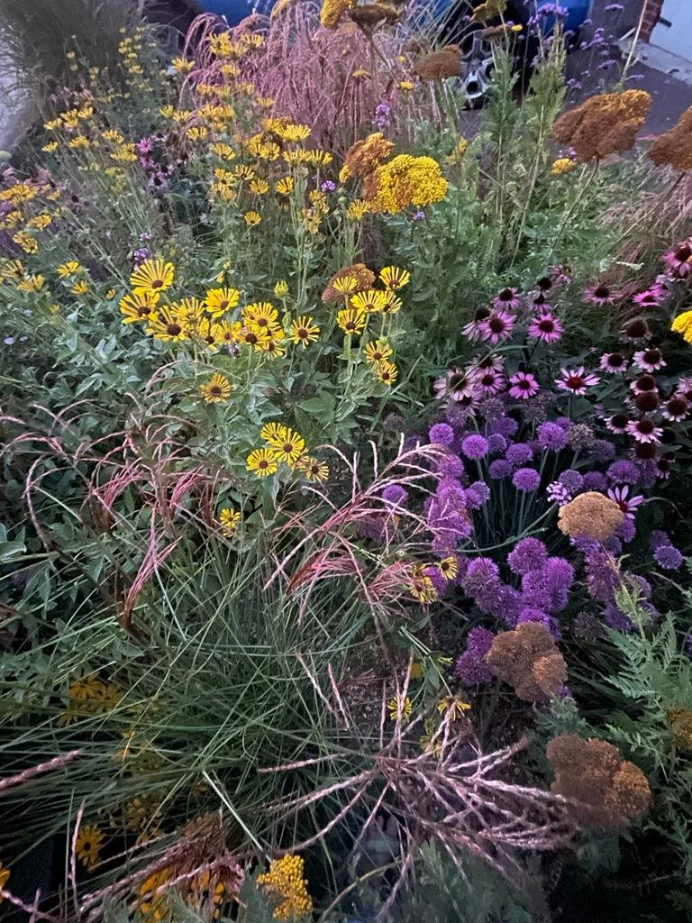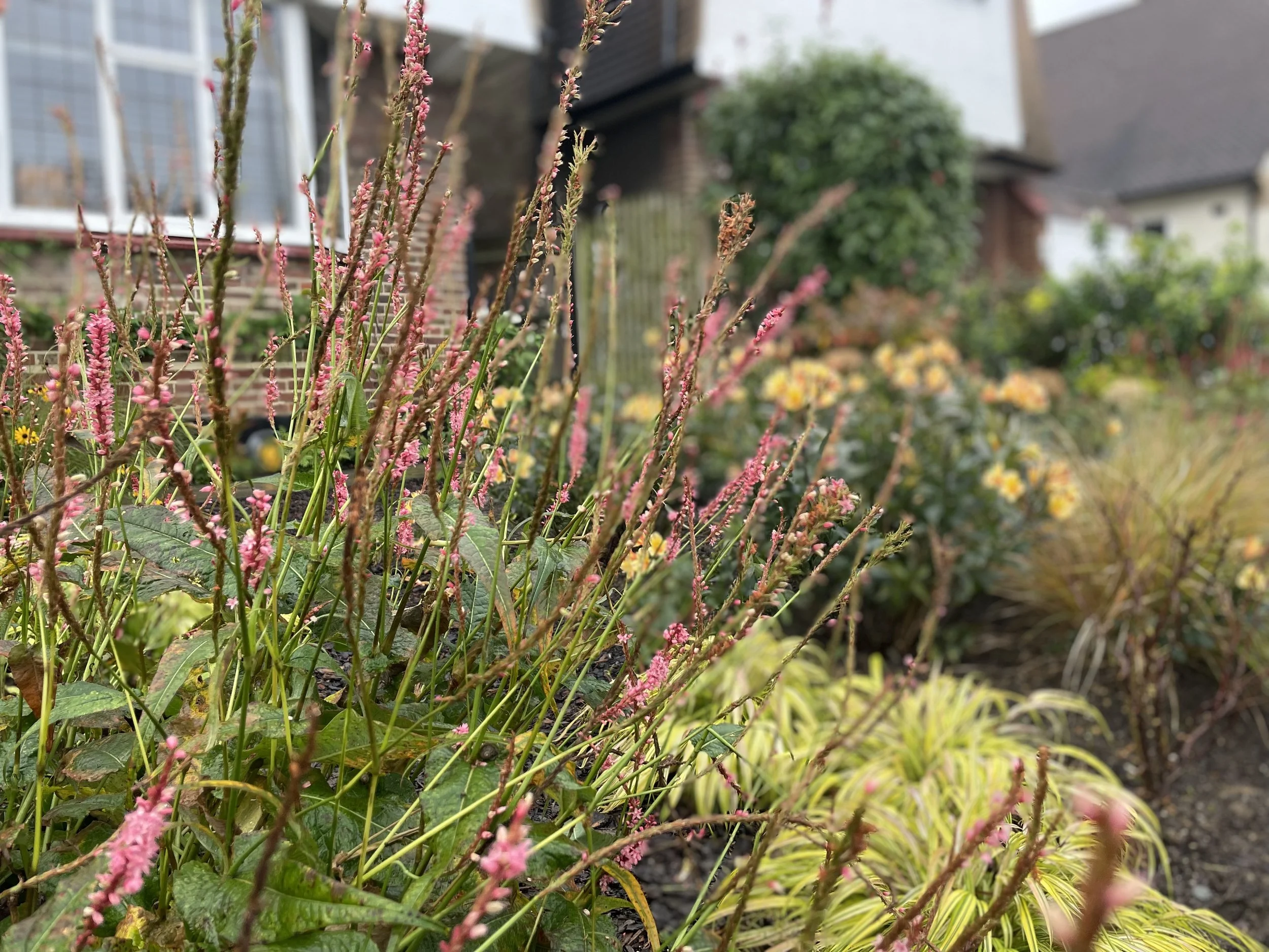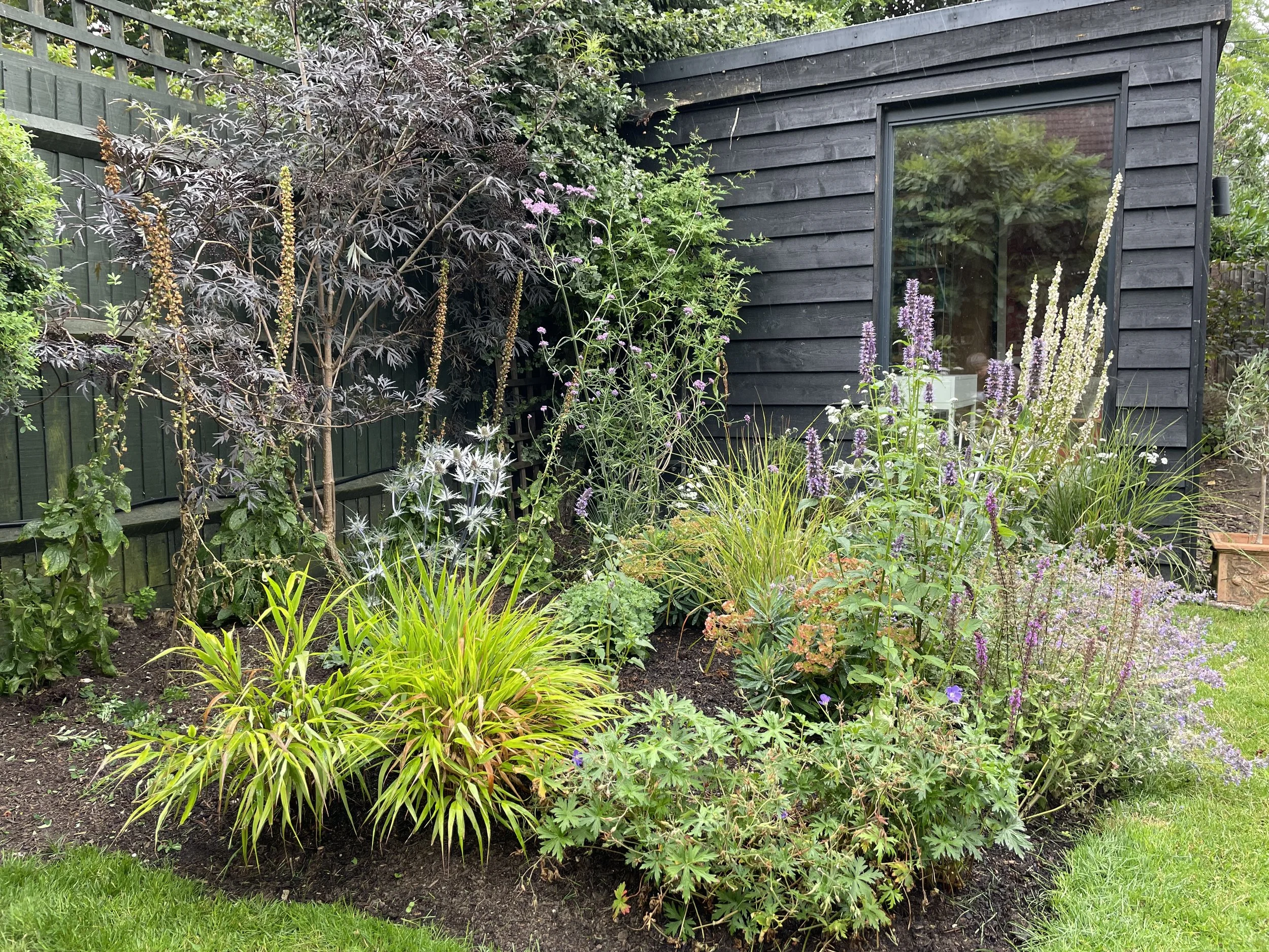 The brief was to fill an uninspiring front garden border with colour and life all year round. We introduced long flowering Geranium and Erigeron to soften the hard landscaping with bright pops of Achillea. In the colder months a small Magnolia stellata and deeply coloured Hellebores take over. The local wildlife loves it and so do the neighbours.