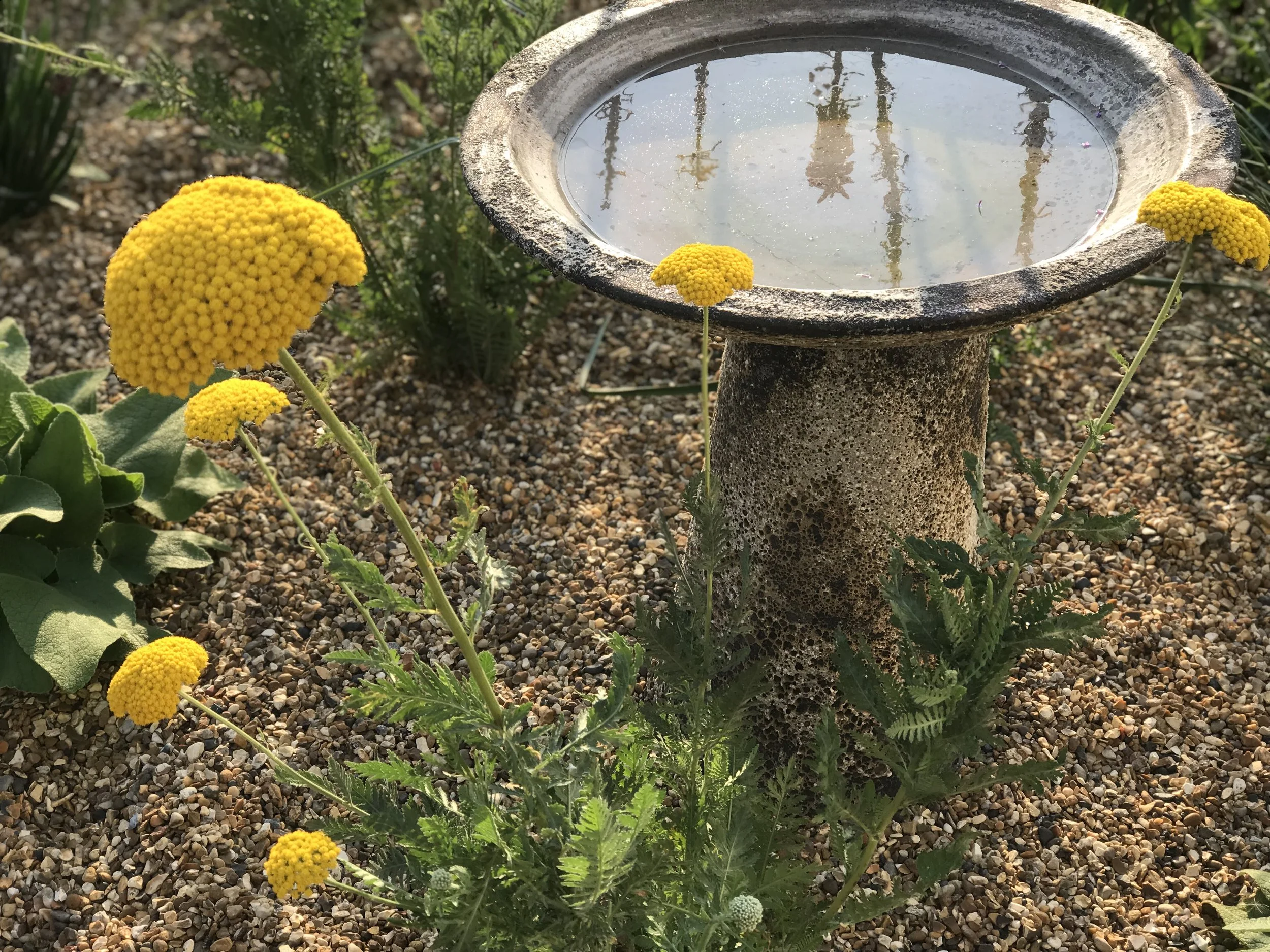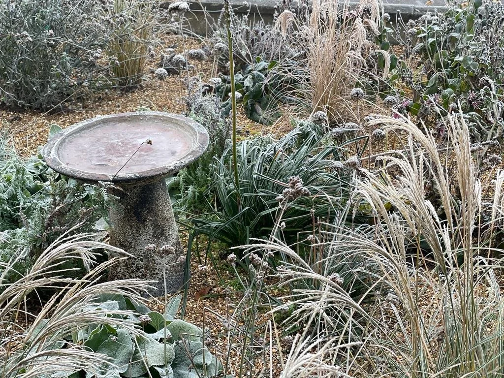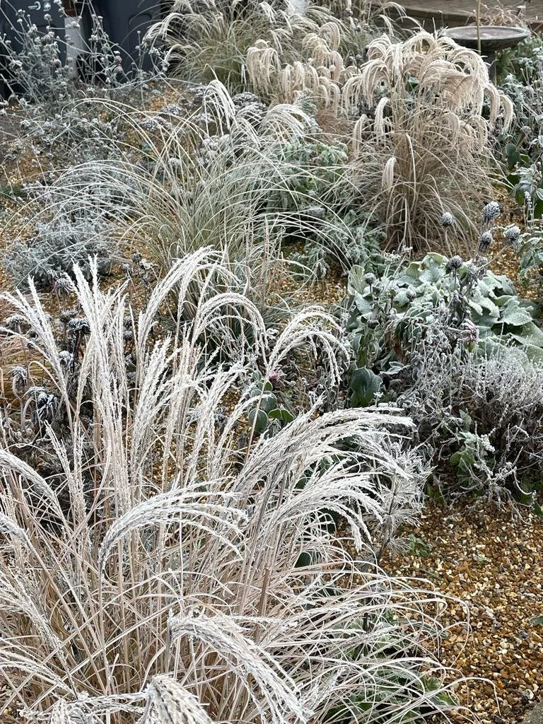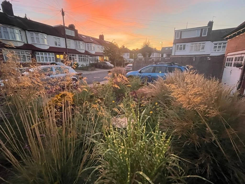 This front garden features vibrant colour, structural grasses and drought tolerant planting. The clients wanted replace the existing lawn and tired shrubs with more contemporary low maintenance planting to create a welcoming space for their young family.The brief was to fill the south facing space with wildlife friendly planting with height and colour and year round interest inspired by the Grasslands Garden at Horniman Museum Gardens. The planting also had to mask the neighbours' cars and wheelie bins to create an all encompassing space the children - and local wildlife - could explore and hide in. The site was sunny and protected so we planned to use miscanthus grasses with tall stipas; colourful flowering plants such as echinacea, rudbeckia and salvia; and more permanant structure was created with mounding lavender and euphorbia.Gravel was used to repress weeds to cut down on maintenance and retain moisture through hot spells. The garden is now full of life - the owners have spotted a hummingbird hawk moth enjoying the nectar and a goldfinch drinking from the bird bath!